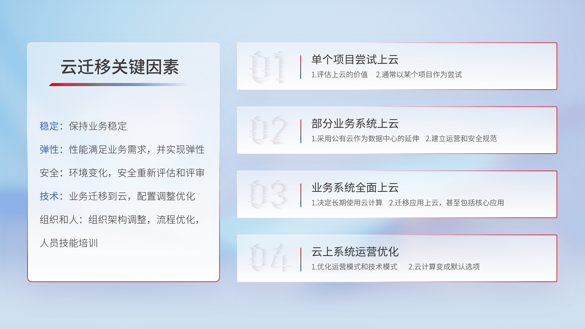 结合实际业务,,,从规划设计、、、云平台选型、、、云原生改造、、数据迁移、、、、集成交付,,,迁移全过程为客户识别最佳上云路径,,,,做好风险识别管理,,,,设计网络架构、、身份权限、、、、安全审计合规、、、操作审计、、、日志审计、、、监控告警策略、、多站点容灾设计等,,对云上基础设施进行整体规划,,,提升IT治理水平,,,,以满足弹性、、高可用、、、高性能的需求。。