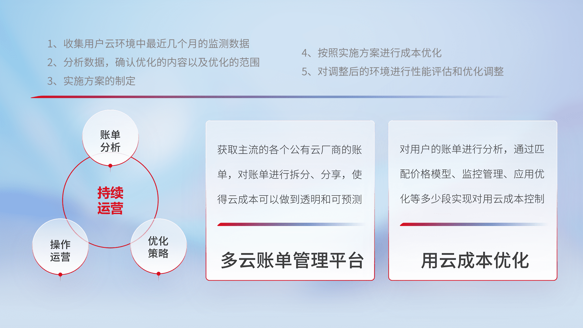 通过多云纳管,,,以统一的资源数据模型把客户的云资源进行抽象和封装,,进而实现对多云资源的统一操作,,保障云资源管理的可靠性、、稳定性与可用性。。量身定制化运维内容,,配置、、开发运维、、、补丁管理、、、备份、、监控、、认证和访问管理、、审计和日常巡检等,,,,保障在用云过程中的可靠度,,稳定度以及高可用率。。
